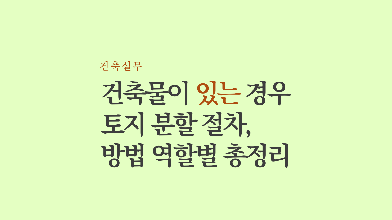 토지 분할은 법적 검토와 행정적 절차가 수반되는 작업입니다. 특히 토지에 건축물이 있는지 여부에 따라 절차가 크게 달라지며, 관련 전문가의 개입이 필요합니다. 토지 분할의 전체적인 절차와 각 과정에서 건축사, 건축주, 그리고 토목전문가의 역할과 업무를 구분하여 정리하려 합니다. 건축물이 있는 경우는 없을 때와 달리 "건축법"에 따른 검토와 추가적인 절차가 필요합니다. 건축사의 역할이 필수적입니다.